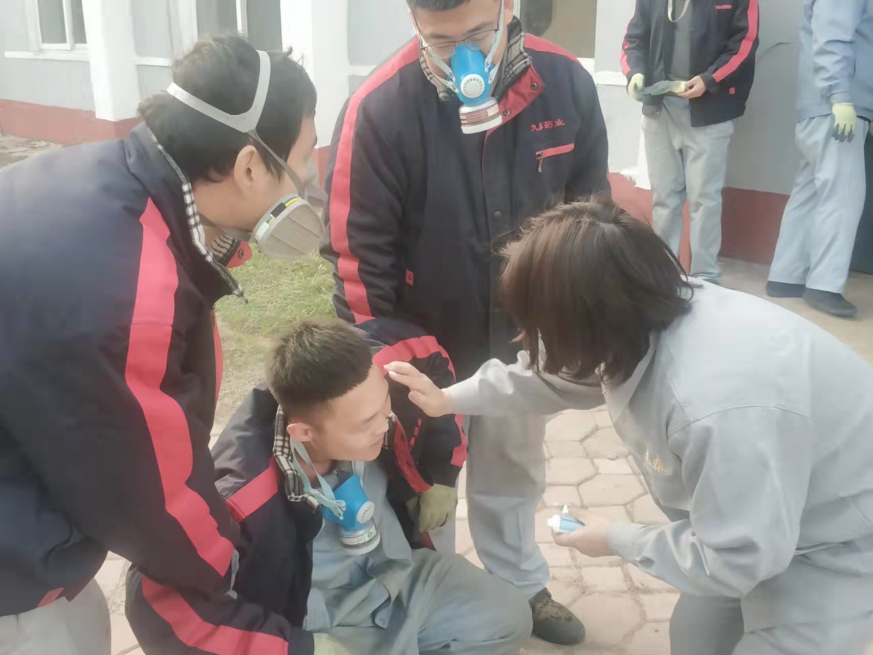 演練模擬原料車(chē)間合成一室發(fā)生火災(zāi)爆炸,車(chē)間立即啟動(dòng)應(yīng)急預(yù)案,進(jìn)行實(shí)際演練。
